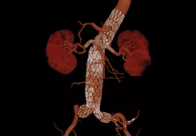 The evolution of EVAR in the early 2000s was driven at Cleveland Clinic by the late Roy Greenberg, MD, a vascular surgeon who helped develop thoracic, thoracoabdominal and arch branched and fenestrated grafts. Today’s stent grafts — fabric tubes supported by a wire scaffold — are guided to the aneurysm site and deployed to seal off the aneurysmal aorta segment, with the graft relining the aorta like an inner tube.