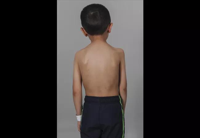 Figures 1 and 2: A child with AFM affecting the proximal muscles in his right upper extremity. Note the muscular atrophy in his supraspinatus fossa, deltoid and biceps. (Photos courtesy of the Shriner’s Hospital for Children, Philadelphia, where Dr. Styron completed a fellowship in pediatric and congenital upper extremity surgery.)