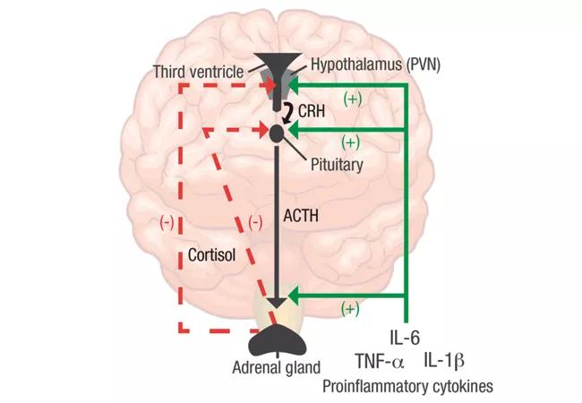 Feature image. The HPA axis in RA. Pro-inflammatory cytokines such as IL-6, TNF-α and IL-1β stimulate cortisol and CRH release by acting at all three levels of the HPA axis (solid green lines). As a result, glucocorticoids regulate their own production through negative feedback on the upper levels of the HPA axis, including CRH in the PVN of the hypothalamus and ACTH in the anterior pituitary (dashed red lines). ACTH: adrenocorticotropic hormone; CRH: corticotropin-releasing hormone; PVN: paraventricular nucleus. Figure and caption republished with permission from Choy EHS, Calabrese LH. Neuroendocrine and neurophysiological effects of interleukin 6 in rheumatoid arthritis. Rheumatology. 2017 Nov 22. doi: 10.1093/rheumatology/kex391. [Epub ahead of print].