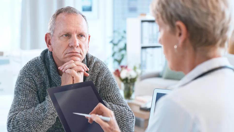 older man looking at a doctor holding an e-tablet