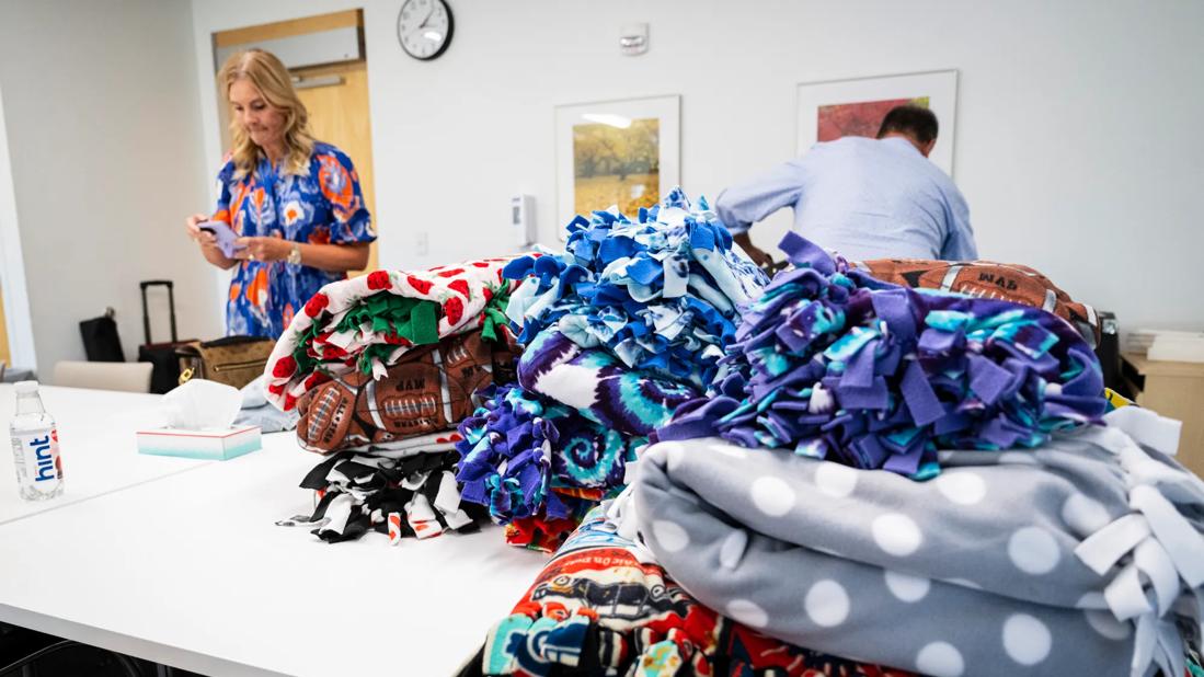 The blanket drive kicks off at the end of October, when Kelly Hancock, DNP, RN, NE-BC, Executive Chief Nursing Officer of Cleveland Clinic, announces the project and sends out instructions for making the 6 x 6-foot blankets. The process is simple: You stack two fleece panels together, cut about three inches into the edges all around the panels, then tie the fringes together to connect the panels.