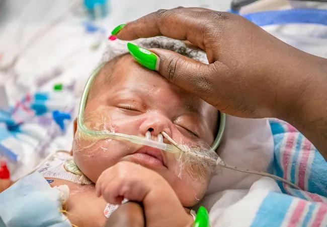 On May 19, 2021, we admitted a 2-month-old born with a double-outlet right ventricle. In this complex congenital heart anomaly, the pulmonary artery and aorta emerge from the right ventricle, and the left ventricle has no outlet. A ventricular-septal defect (VSD) also was present. Typically, VSDs are found below the aortic or the pulmonary valve. In this case, it was remote from either valve, which eliminated the possibility of a traditional repair. The infant had been on a ventilator since birth and was deteriorating rapidly. When his providers in the other center were unable to agree on a treatment plan, the parents requested their child be transferred to Cleveland Clinic Children’s.