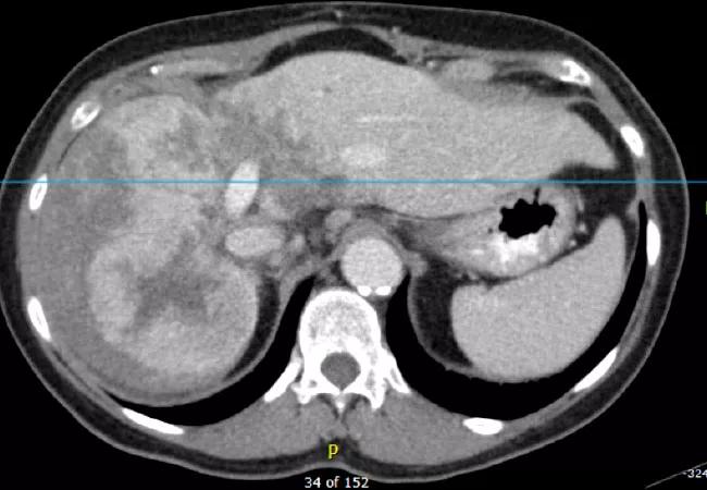 This case was presented to a multidisciplinary liver tumor board, including specialists in hepatology, medical oncology, radiation oncology, surgery, radiology and interventional radiology. The board devised a novel two-pronged approach: radioembolization with yttrium-90 (y90) microspheres for the right lobe and stereotactic body radiotherapy (SBRT) for the left lobe.