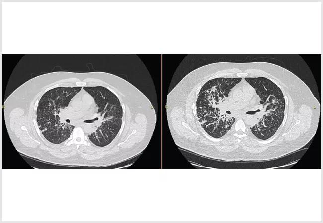 He was referred to the Cleveland Clinic for sarcoidosis. At the initial visit, he had normal spirometry without obstruction, forced vital capacity of 88% and DLCO of 102% and was asymptomatic. He was followed serially for a year until developing shortness of breath. Repeat imaging demonstrated progressive interstitial disease, and repeat pulmonary function testing showed new moderate obstruction and a drop in FVC to 79% predicted.