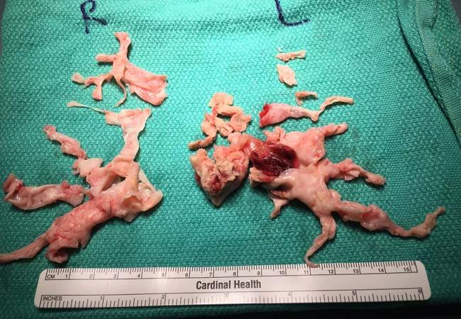 The team was able to complete work on each side within the requisite 20 minutes, with the patient’s circulation restored between the two sessions. Overall, the team managed to remove all of the clot with no complications. The photo below shows the extracted specimen.