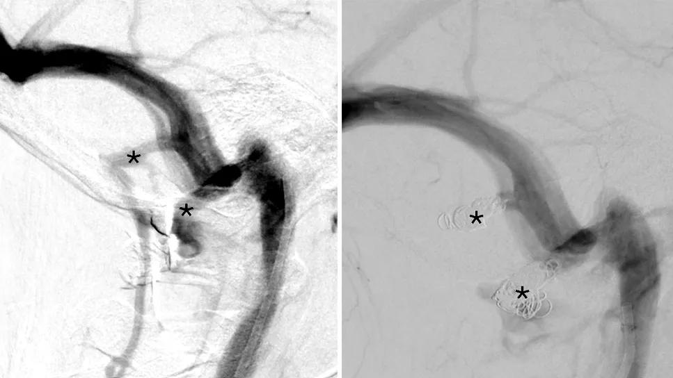 With the patient under general anesthesia, a microcatheter was placed in each emissary vein, which were then closed using intracranial coils. Dr. Raymond notes that he prefers these devices, which are typically used for cerebral aneurysms, over coils approved for vein embolization.