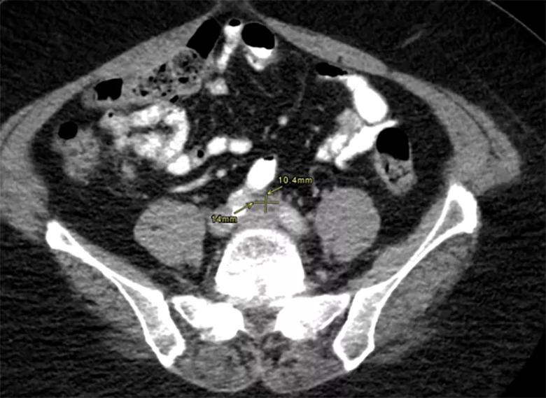 CT imaging of the patient’s chest revealed pulmonary nodules and axillary lymphadenopathy. Imaging of her abdomen revealed a 22.4 mm x 18.1 mm soft-tissue lesion between the proximal common iliac arteries, eccentric soft-tissue thickening along the left anterolateral wall of the abdominal aorta, and mild infiltration adjacent to the distal abdominal aorta, which was concerning for retroperitoneal fibrosis (Figure 3). Subtle haziness adjacent to the pancreatic tail was also seen, which raised the possibility of autoimmune pancreatitis.