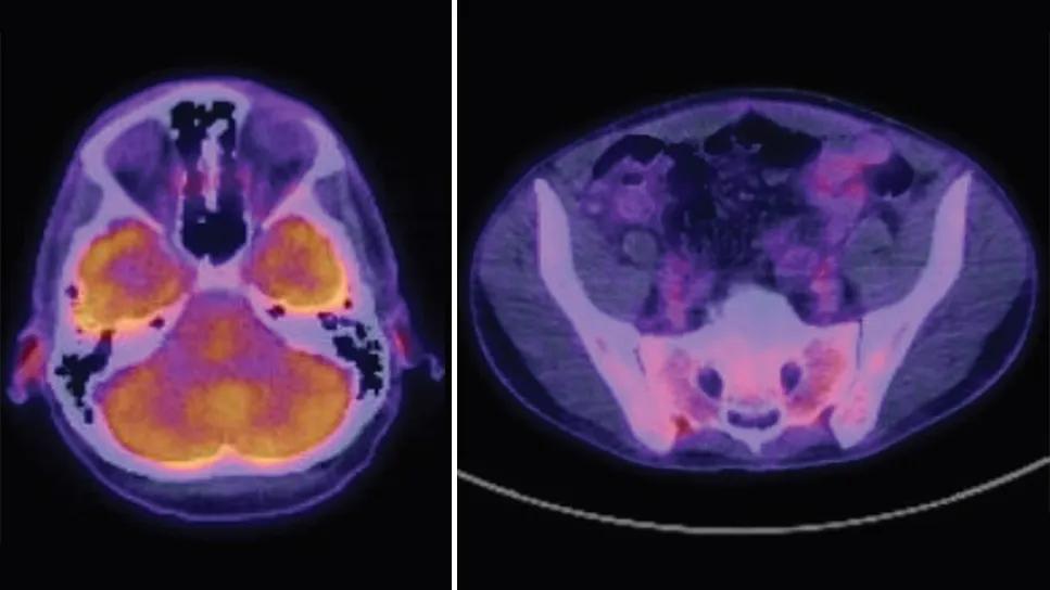Additional imaging of the patient's abdomen revealed para-aortic retroperitoneal lymph nodes. The patient was transferred to Cleveland Clinic for consideration of an additional tissue biopsy. A positron emission tomography (PET) scan demonstrated patchy increased metabolic uptake in the cervical spine along with the bilateral sacroiliac (SI) joints, anterior costovertebral joints, and external auditory canal cartilaginous segments (see images above).