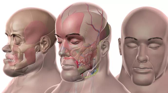 The procedure involved transplanting approximately 90 percent of the patient’s face (Figure), including about two-thirds of the scalp plus the forehead, upper and lower eyelids, nose, upper cheeks, upper jaw, orbital floor, facial nerves, parotid glands and muscles of facial expression. Tissue types involved included skin, muscles, nerves, arteries, veins and bony structures including the zygomatic arches, zygomatic body, maxilla and all the upper teeth.