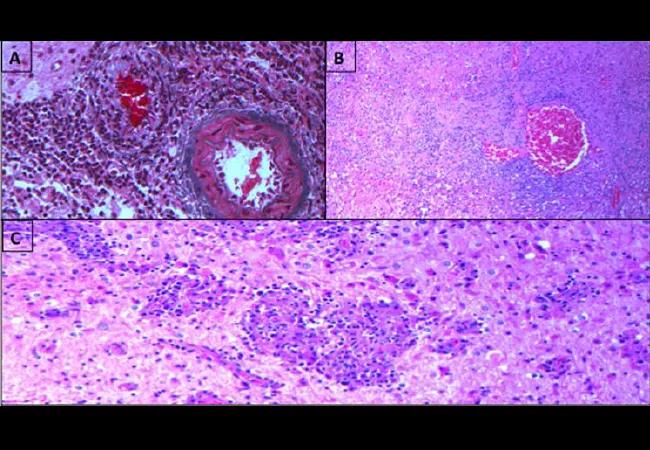 Feature image: Demonstrates two blood vessels in the meninges (movatstain) — one vessel is normal and the other is overrun by inflammatory cells; (B) a large area of geographic necrosis with nuclear debris; the adjacent are as reveal a predominantly chronic inflammatory cellular infiltrate; and (C) a non-necrotizing granuloma. Image and caption republished with permission from Elsevier.