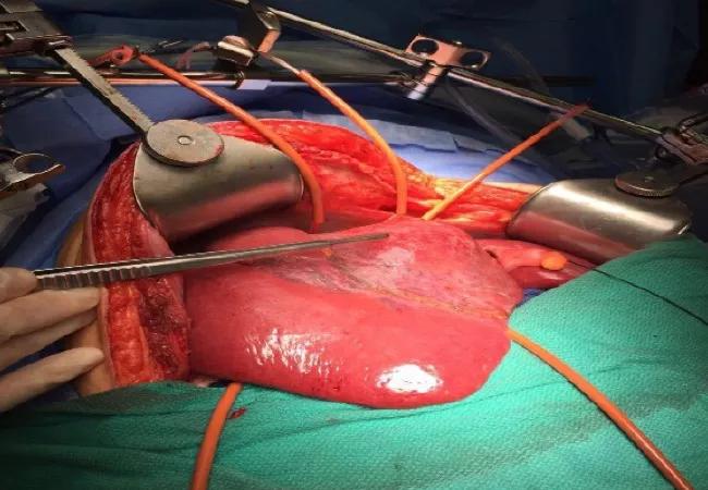 Total vascular control (supra-hepatic and infra-hepatic vena cava, and liver hilum) in preparation for parenchymal transection.