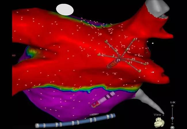 A map of the left atrium showing electrical isolation (red) of the pulmonary veins and the posterior wall that is characteristic of results with the Convergent Plus procedure.