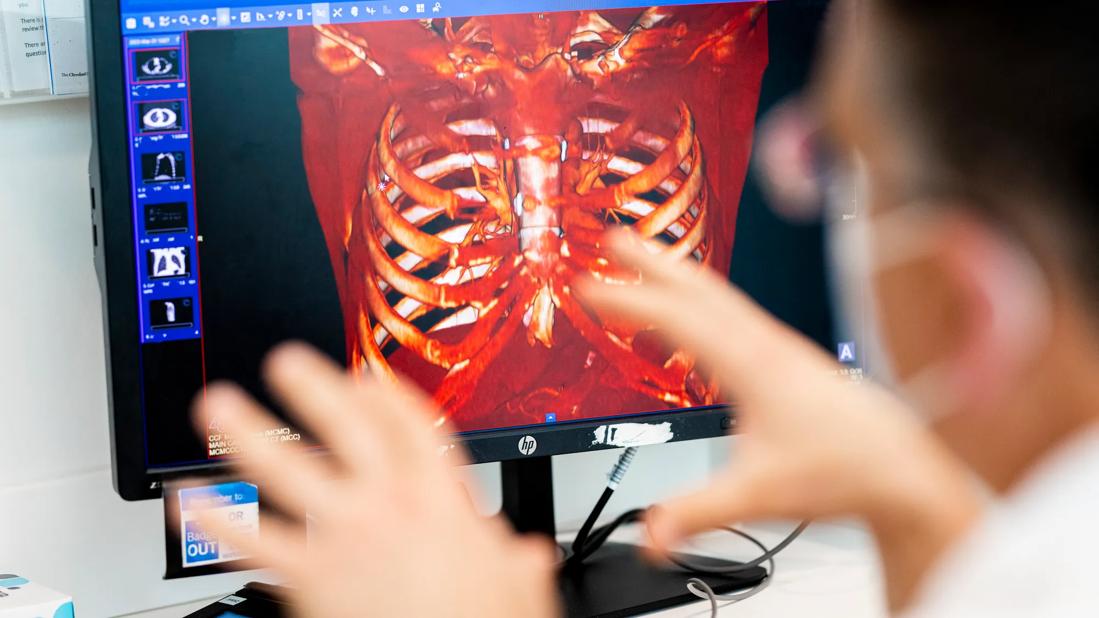 This was true recently when Dr. Mesko partnered with thoracic surgeon Daniel Raymond, MD, of Cleveland Clinic’s Department of Thoracic and Cardiovascular Surgery, on two separate chondrosarcoma cases. Chondrosarcoma, a rare and malignant primary bone sarcoma that develops in cartilage cells, can be difficult to diagnose and treat. Tumor resection is the preferred management of the disease.