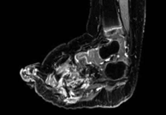 Caption: CT scans (A, B) at baseline and (C, D) after two months of treatment with selpercatinib of the left foot in a patient with an NCOA4-RET fusion–positive lipofibromatosis. Selpercatinib treatment resulted in a significant decrease in tumor burden leading to improvements in gait and locomotion.