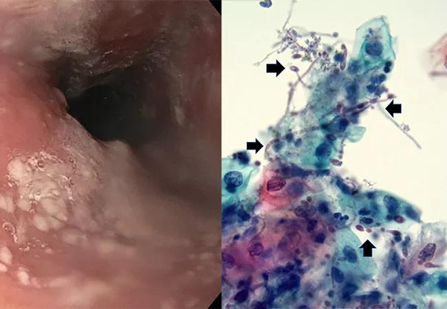 Top left image: Upper endoscopy shows localized white plaques in the middle third of the esophagus that could not be washed off with water irrigation. Top right: A cytologic examination revealed benign squamous cells and occasional neutrophils. There were numerous admixed fungal spores and pseudohyphae (arrows) staining red, morphologically consistent with Candida spp.