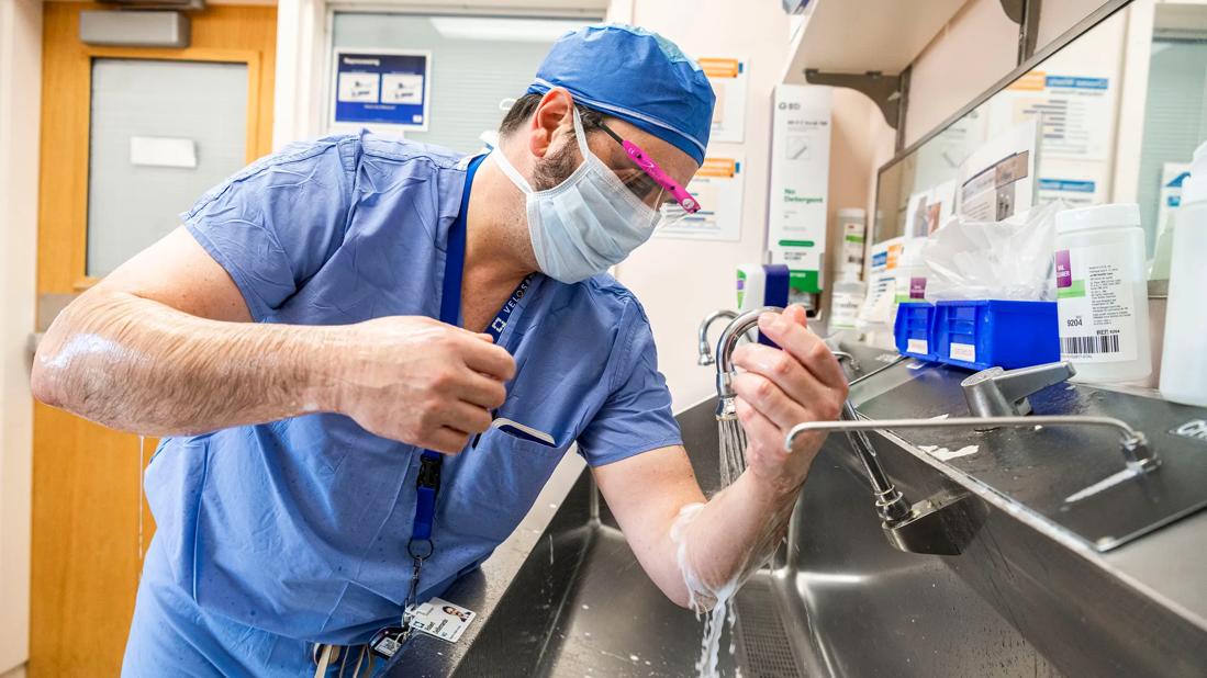 Doctor scrubbing before surgery