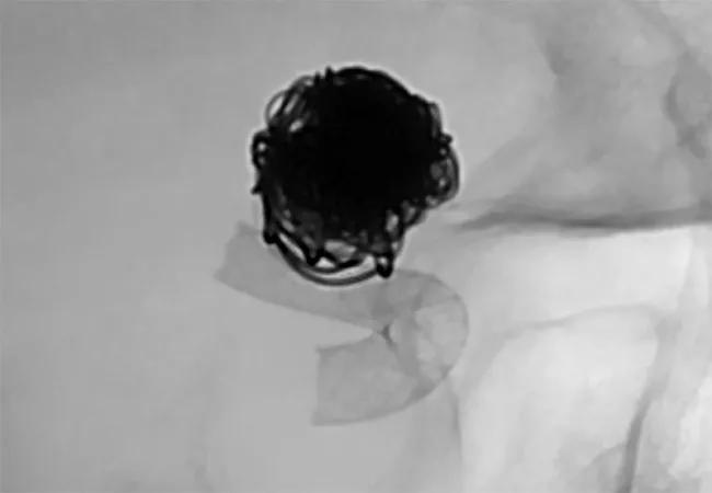 She stayed in the neurological intensive care unit for two weeks, during which time she required a ventricular shunt to drain fluid from her brain. Following placement of the shunt, we were able to start her on aspirin and clopidogrel to prevent clots from forming within the flow diverter device. Once her medications were on board, we performed a second angiogram using the Surpass Streamline™ Flow Diverter (Stryker) to restrict blood from entering the aneurysmal sac, thereby promoting clotting within the aneurysm. The procedure took approximately 30 minutes.