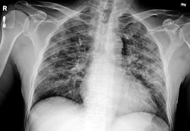 Chest images from a patient who ended up in the ICU with suspected lung injury related to vaping. The images show improvement of lung opacities with no specific treatment other than avoiding exposure while in the hospital.