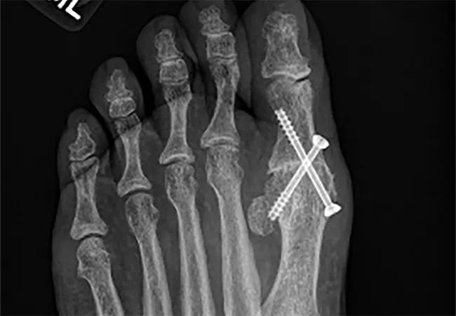 A healthy 52-year-old fitness instructor presented with bilateral hallux rigidus (Figure 1). She initially underwent arthrodesis of the left great toe. Two years later, the contralateral fusion was elected. Now she is at full unrestricted physical activity and pain-free with bilateral first MTP joint fusions (Figures 2-4).