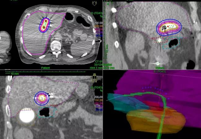 Dr. Stephans: Perihilar cholangiocarcinoma treatment is a three-step process. External hyperfractionated radiotherapy is delivered twice per day, Monday through Friday, for three weeks. Approximately one week after completing external radiation, the patients are admitted for three days and given high-dose brachytherapy, which is delivered internally from within the bile ducts.