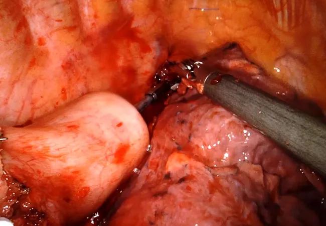 Now Cleveland Clinic surgeons are increasingly turning to robotics to offer a minimally invasive option to patients requiring esophagectomy. A snapshot of robotic esophagectomy is presented above, showing engagement of an end-to-end anastomosis stapler to connect the gastric conduit with the proximal esophagus.