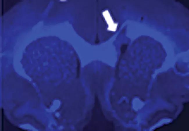 Figure 3. Myelivid is a sensitive radiotracer. Brain tissue from a murine model was stained with radiolabeled Myelivid and detected using autoradiography. Arrows indicate myelin lesions, which show up as bright spots in the autoradiograph due to decreased Myelivid uptake in these areas.