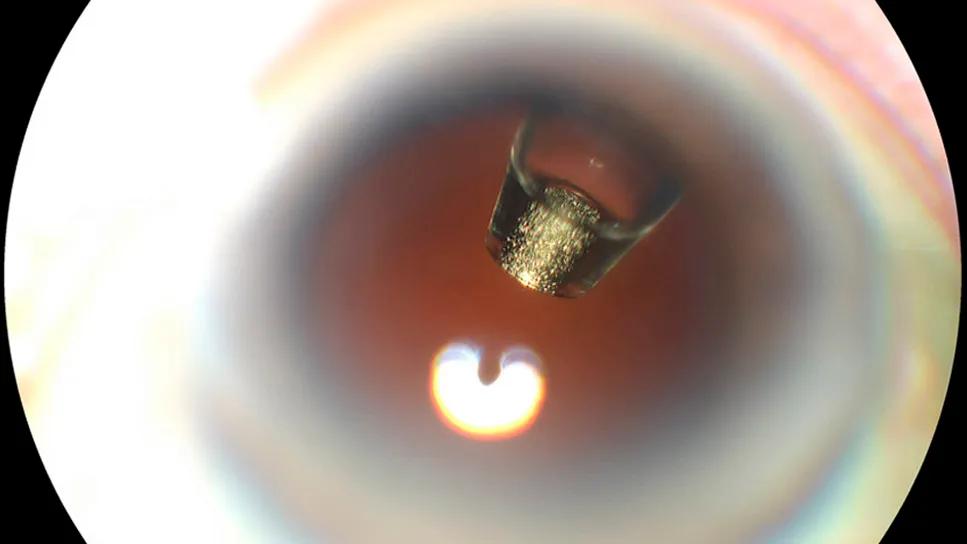 The ranibizumab port delivery system (shown inside the eye of a patient, above) was originally approved after the phase 3 Archway study. Archway was an open-label, randomized clinical trial involving patients previously treated for nAMD. The primary endpoint was the change in best-corrected visual acuity (BCVA), which the treatment did achieve. And, the center point thickness of the retina didn’t change a bit when compared with monthly ranibizumab injection.