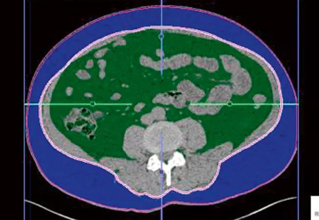 Figure 1. Visceral fat area (VFA) shown in green; subcutaneous fat area in blue. This CT scan shows VFA was 50.4 percent.