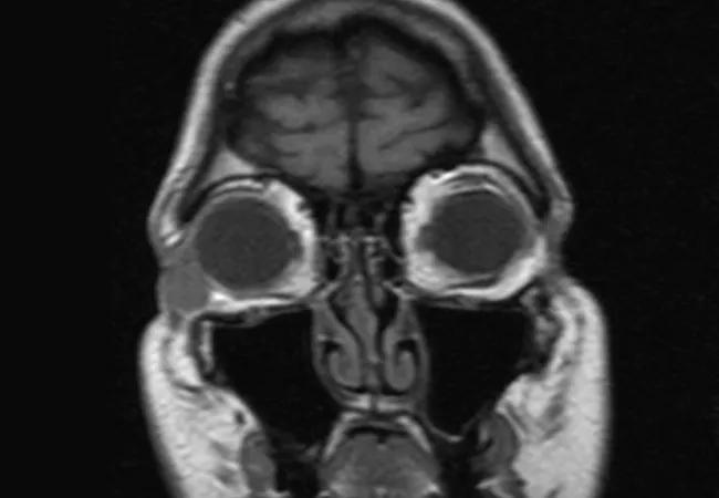 B. T1 weighted coronal MRI showing well-circumscribed nodule in the inferotemporal orbit, which is isointense to muscle
