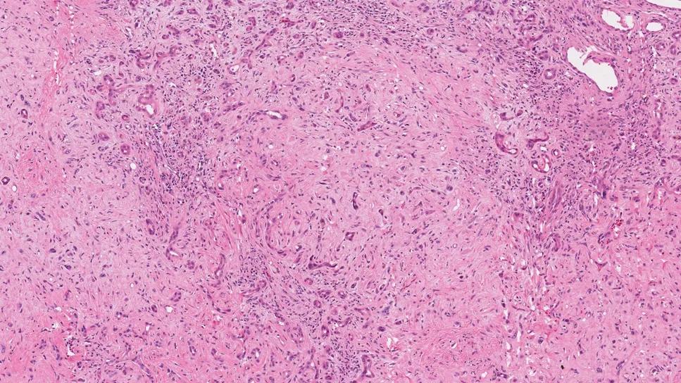 Cleveland Clinic pathologist Clifton Fulmer, MD, PhD, reviewed the case, including the previous pathology from the outside hospital. While the morphologic features seen on the slides were unequivocally neoplastic, they were not classic for cholangiocarcinoma or any of its variants, and the imaging features didn’t fit the profile of the disease. In addition, the blood-based tumor marker for cholangiocarcinoma was only weakly elevated.