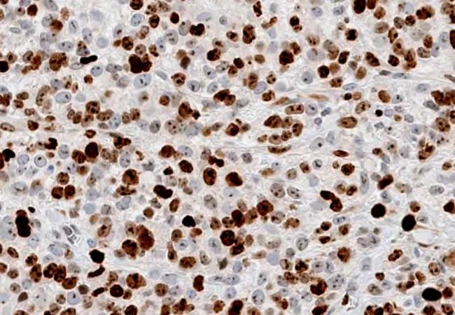 Quantitative image analysis of NSC668394-treated tumors sections (n = 5) showed decreased Ki67 (p < 0.01) when compared to DMSO-treated tumor sections. Image originally published in: Proudfit A, Bhunia N, Pore D, Parker Y, Lindner D, Gupta N. Pharmacologic inhibition of ezrin-radixin-moesin phosphorylation is a novel therapeutic strategy in rhabdomyosarcoma. Sarcoma. 2020. https://doi.org/10.1155/2020/9010496