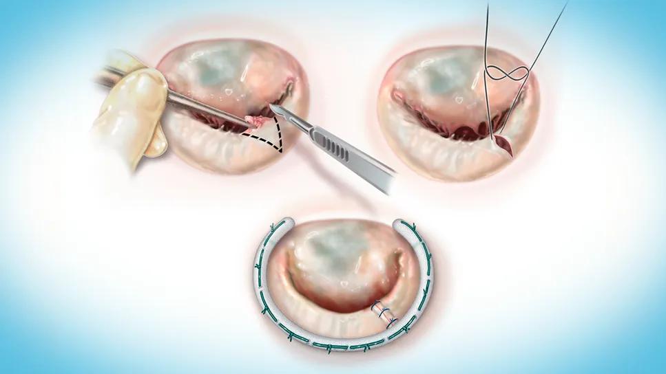 Figure. Three key steps of a triangular resection, one of the five cornerstone techniques of mitral valve repair championed by Cleveland Clinic. When combined with an annuloplasty (panel C), triangular resection is all that’s needed to repair segmental posterior leaflet prolapse, one of the most common lesions in degenerative mitral valve disease.