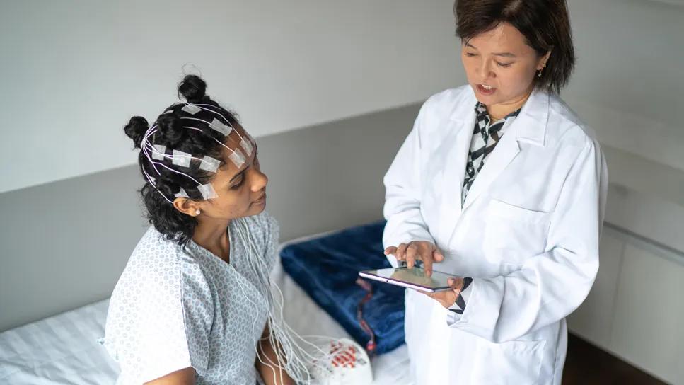 woman preparing for sleep study with healthcare provider