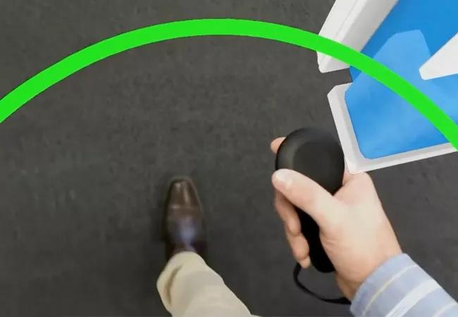 The AR cue is a collection of images that appear on the floor at the glasses-wearing patient’s feet and are designed to mimic laser lines projected onto the floor (see video example).