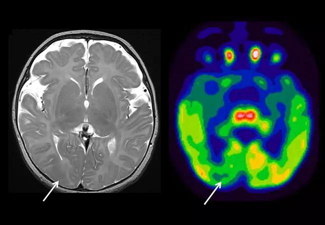 Image at top shows T2-weighted MRI and FDG-PET images from a 3-month-old infant with epileptic spasms and focal seizures. Arrows indicate focal areas of hypointensity and hypometabolism consistent with focal cortical dysplasia.