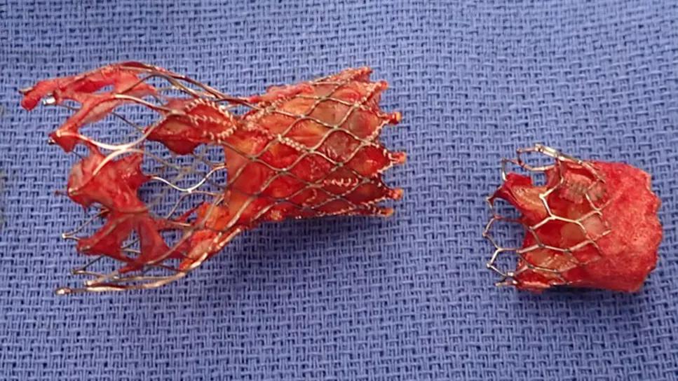 Explanted Evolut and Sapien TAVR valves from the same patient. The Sapien valve, which lasted one year, was placed into the Evolut valve after the latter showed early deterioration after three years.