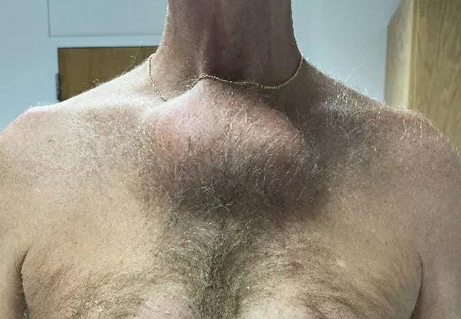 The tumor did not appear to involve deeper thoracic structures, however its removal would be a formidable challenge. Along with most of the sternum, both sternoclavicular joints — the only skeletal attachment between the arms and axial skeleton — would need to be resected and then reconstructed.