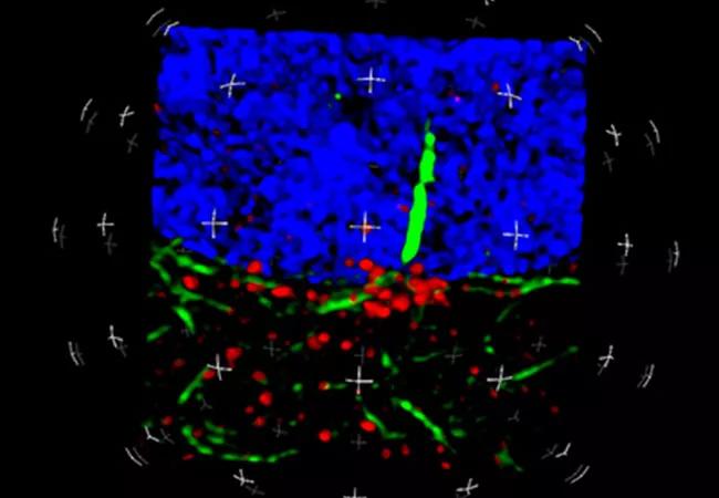 Photo: A 3D super-resolution confocal microscopy image showing a primary cilium in green and vesicles containing ADAMTS9 accumulating at the base of the cilium in red. Image captured at 1000x optical magnification.