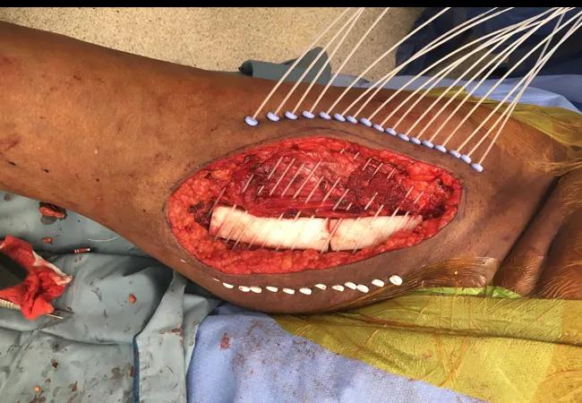Brachytherapy as definitive treatment – By utilizing brachytherapy as definitive treatment, we can forego preoperative radiation and instead remove the tumor shortly after diagnosis. Catheters are implanted at the time of surgery, and radiation is completed while the patient is in the hospital. The patient returns to the operating room for catheter removal and final soft tissue reconstruction, usually within five to 10 days. In addition to earlier tumor resection, this technique obviates the need for patients to return daily for radiation therapy. Furthermore, use of brachytherapy can simplify wound reconstruction in combination with plastic surgery. Reconstruction is scheduled at the completion of brachytherapy, when surgical margins are confirmed and the plastic surgeon has prepared for the known soft tissue defect and planned reconstructive options (Figures 2 and 3).