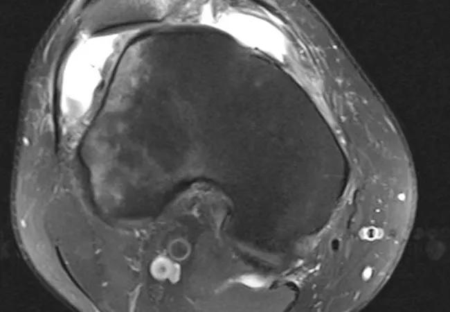 Figure 3. Patella alta. The inferior patellar cartilage (arrowhead) sits above the trochlear articular cartilage (arrow), demonstrating severe patella alta. Normally there is chondral overlap.