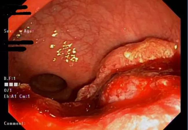 Endoscopy at the time of diagnosis shows the rectal adenocarcinoma.