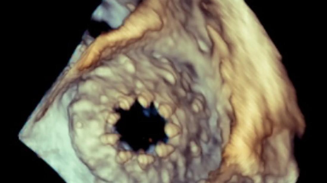 3D transesophageal echocardiography (TEE) image of a tricuspid valve with severe regurgitation.