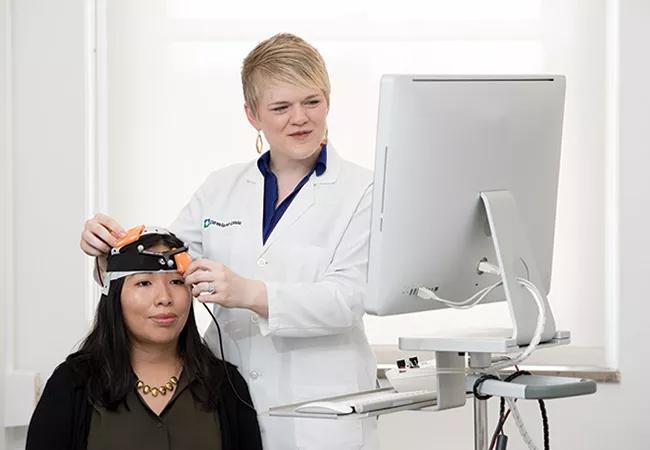 The intervention is noninvasive and inexpensive and can easily be added to a patient’s normal clinical care, notes Dr. Potter-Baker, who is shown demonstrating use of the tDCS device in the photo above. Each study subject’s intervention involved physical therapy designed by physical therapists to target individual patient goals, which is typical of routine rehabilitation, she adds.