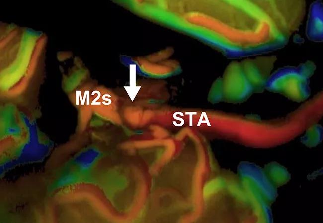 Figure 4. FLOW 800 time-to-arrival map after the bypass and occlusion of the aneurysm (and MCA superior trunk) with a clip. The map demonstrates brisk filling of the superior division via the bypass. The superficial temporal artery (STA) bypass graft, recipient MCA superior trunk (M2s) and end-to-side anastomosis (arrow) are indicated.