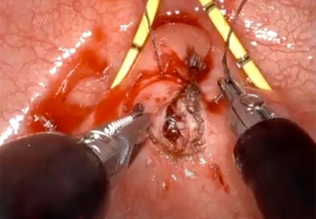 In the intraoperative video below, the surgeons separate the hole or “the communication between the bladder and the vagina.” Then they raise the flap tissue around it and close it sequentially side-by-side.